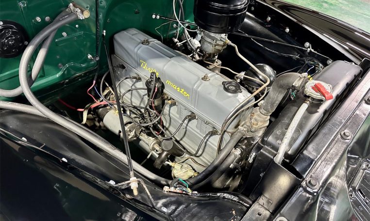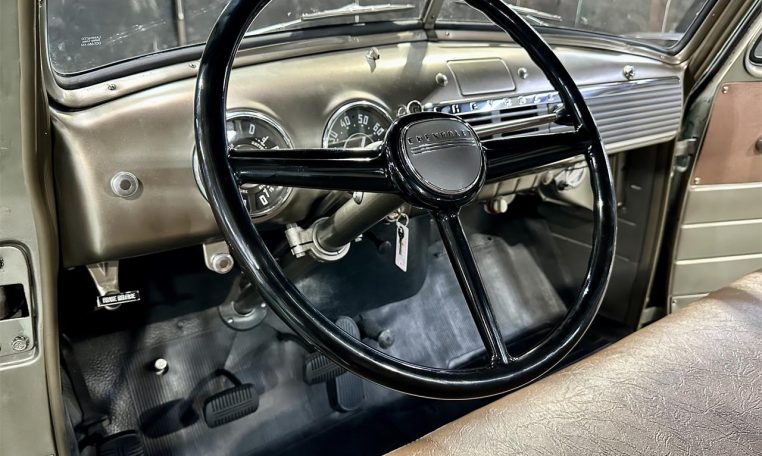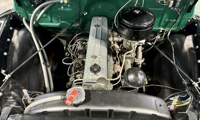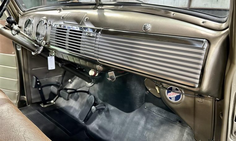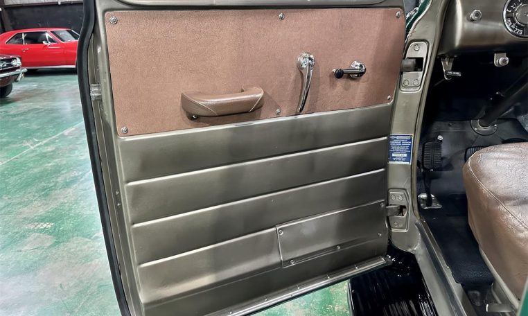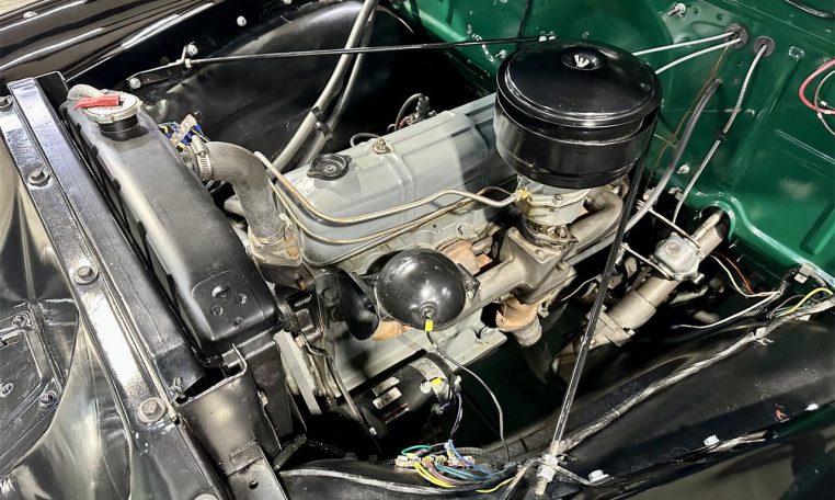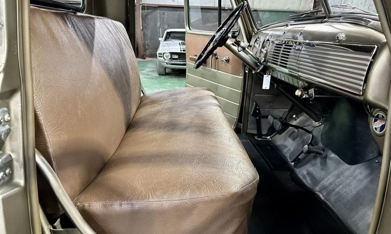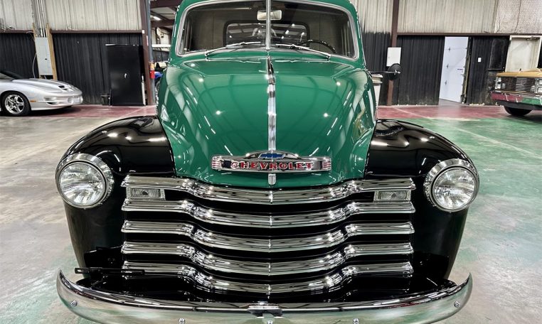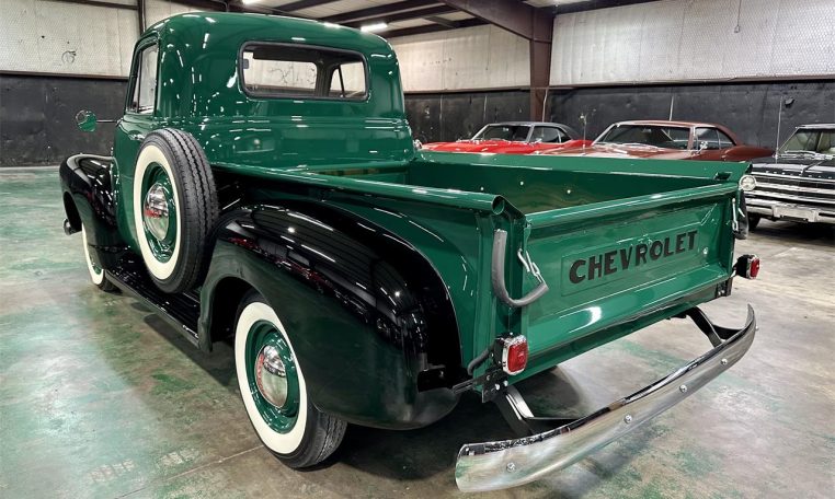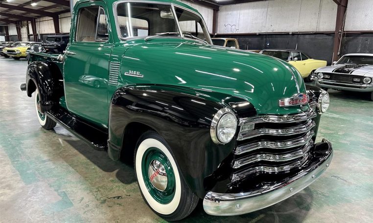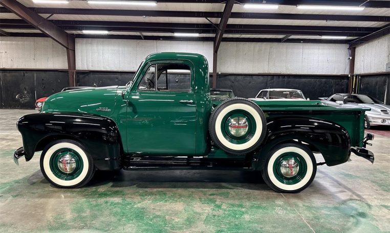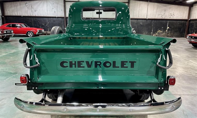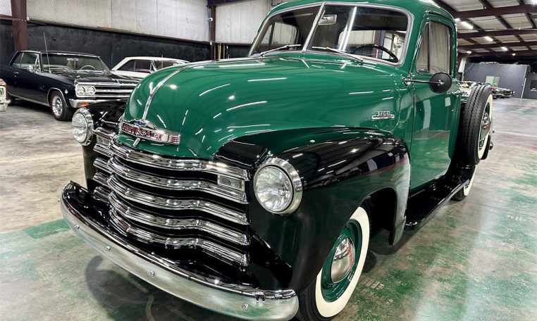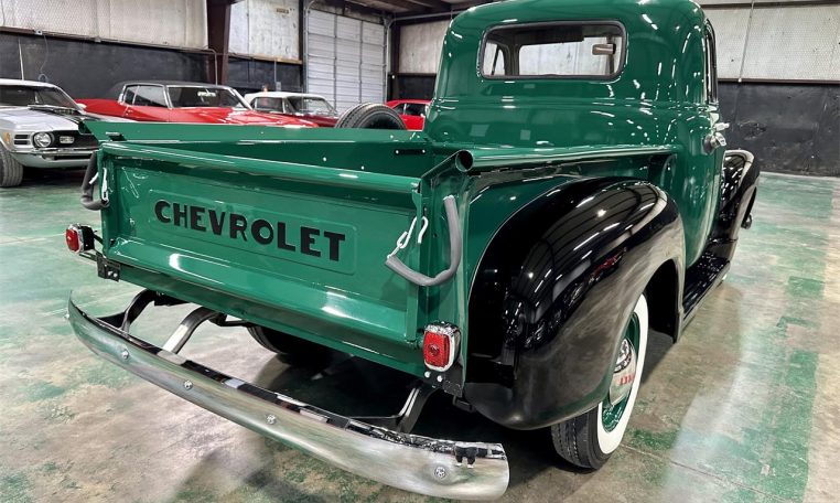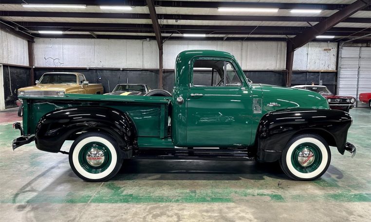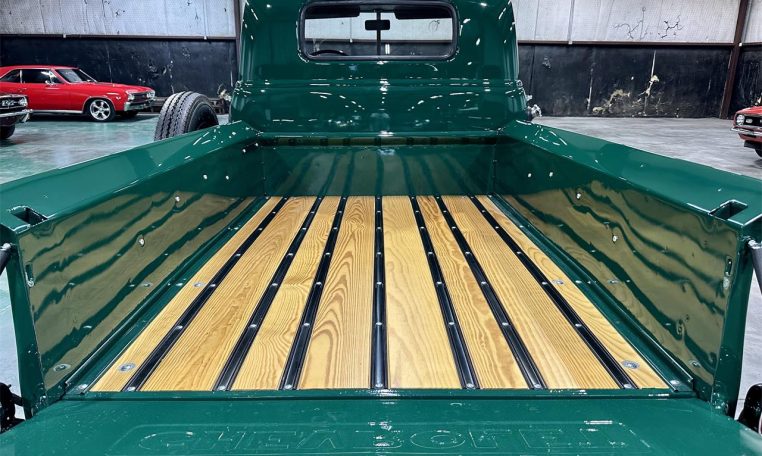 This beautifully restored 1953 Chevrolet 3100 Pickup features a strong rebuilt 216 inline 6-cylinder engine paired with a 3-speed manual transmission and original 3:55 rear gears. Finished in classic green with black fenders and running boards, it boasts a very nice wood bed kit, restored vacuum wipers, and 16′ wheels wrapped in Coker radial tires. The three-window cab houses a stock-style bench seat interior with factory-style gauges and a column-mounted 3-speed shifter. Manual steering and brakes (drum) maintain its original driving feel. With a solid body, very clean underside, and an odometer reading 1,108 miles (unverified), this frame-off restoration comes with a folder of miscellaneous receipts from the restoration.