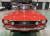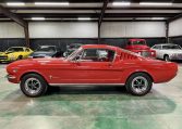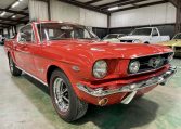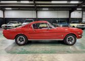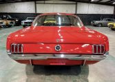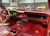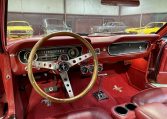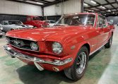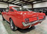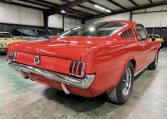 This 1965 Ford Mustang Fastback is a striking example of classic American muscle, finished in bright red over a matching red interior. Originally Smoke Gray from the factory, the car now sports a solid body and fresh paint, complemented by 15″ Magnum 500 wheels and fog lights. Under the hood is a strong-running 347 V8 paired with a C4 automatic transmission. Mechanical upgrades include headers, dual exhaust with aftermarket mufflers, an aluminum radiator, welded-in subframe connectors, front and rear sway bars, and power 4-wheel disc brakes. The car features manual steering and a clean, factory-style interior with bucket seats, a floor shifter, fold-down rear seat, and auxiliary gauge pod under the dash. The odometer shows 35,998 miles (actual mileage unknown).