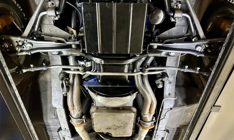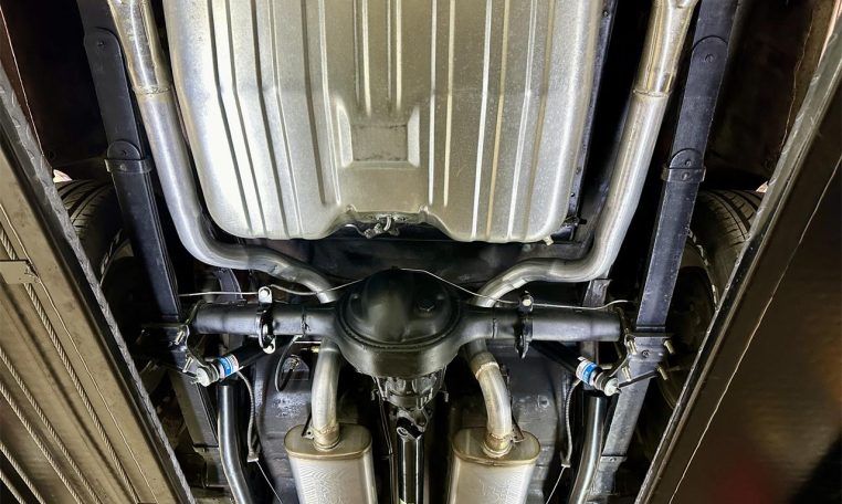 It features power steering, power front disc brakes, rear drums, and cold Classic Auto Air A/C. Other upgrades include subframe connectors, a shock tower brace, Shelby GT350 alloy wheels, and Custom Autosound radio with rear 6×9 speakers. Odometer reads 83,402 miles (believed original but unverified).