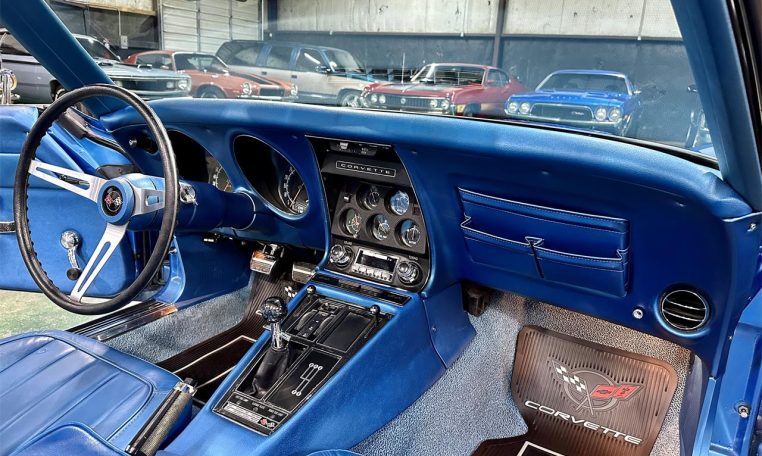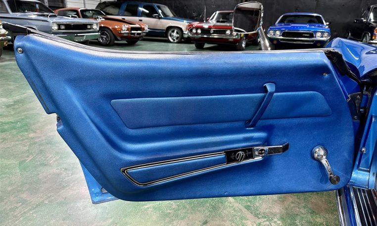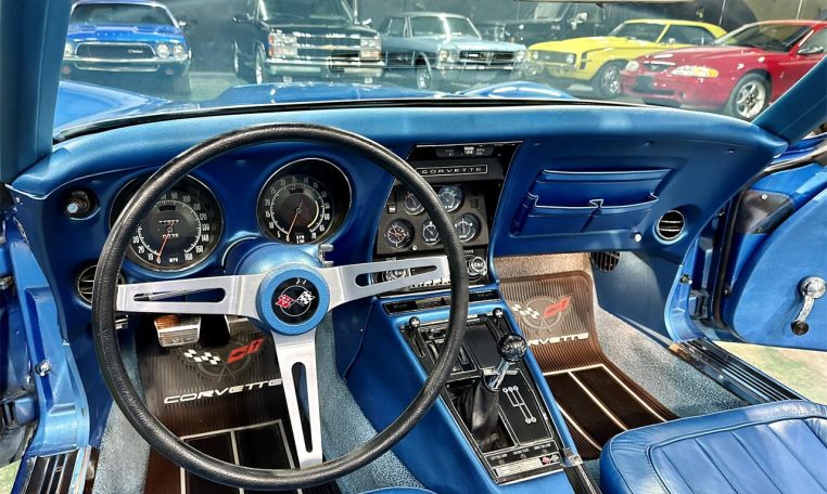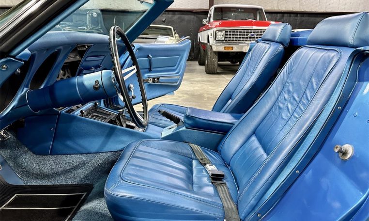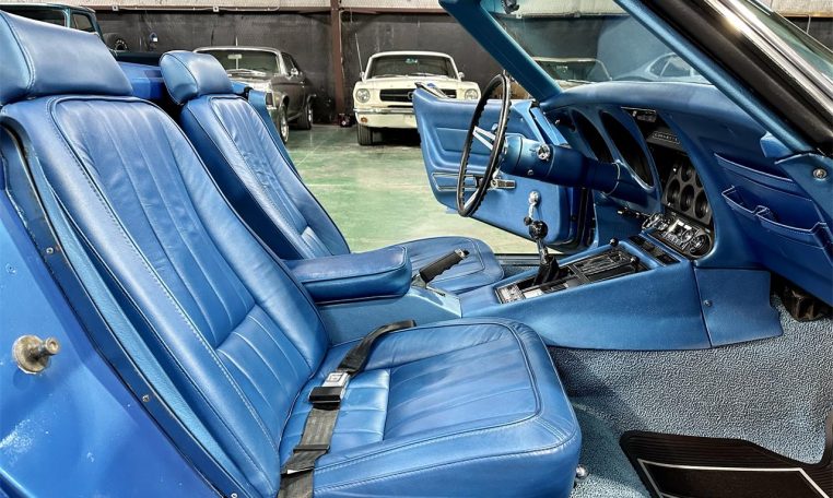 Lemans Blue exterior (original color, repainted) with black convertible top. Blue bucket seat interior with center console and factory tach.