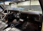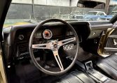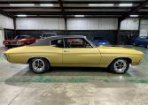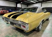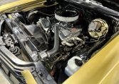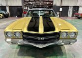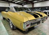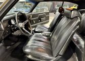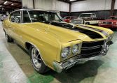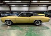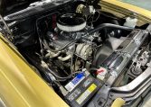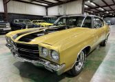 This 1970 Chevrolet Chevelle features a strong GM crate 350 V8 engine paired with a Turbo 350 automatic transmission and a 10 bolt rear end. It has power steering and power front disc brakes with drilled and slotted rotors, along with front drop spindles and rear lowering springs. Finished in solid Champagne Gold with a black vinyl top, the car sports a cowl hood with black SS stripes and trim (not a true SS). It rides on new 15″ SS wheels with fresh 235/60-255/60 tires. Inside, the black bucket seat interior includes a center console, floor shifter, tilt steering column, and Comfort Grip steering wheel. The Chevelle runs and drives great and is very solid underneath. Odometer reads 40,269 miles (unverified).