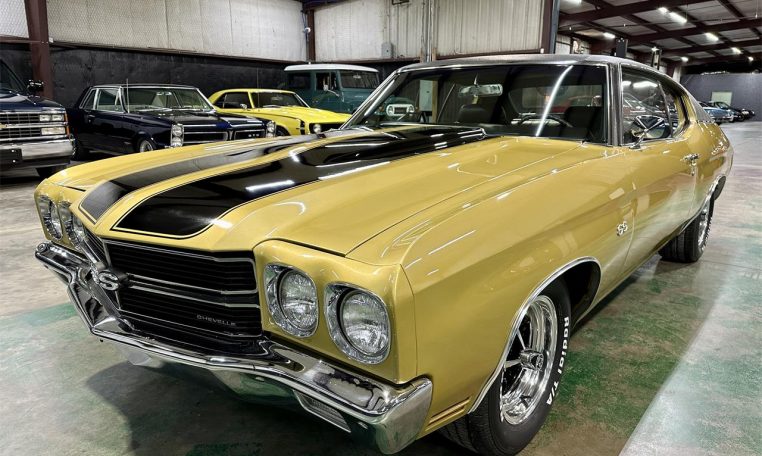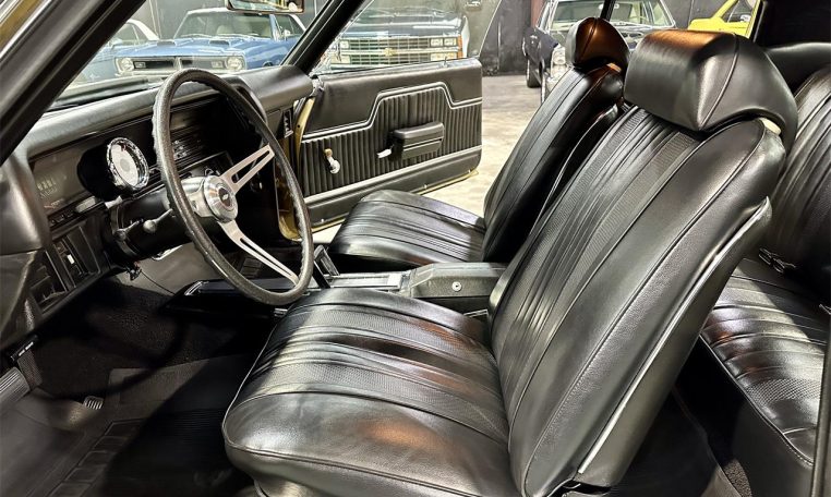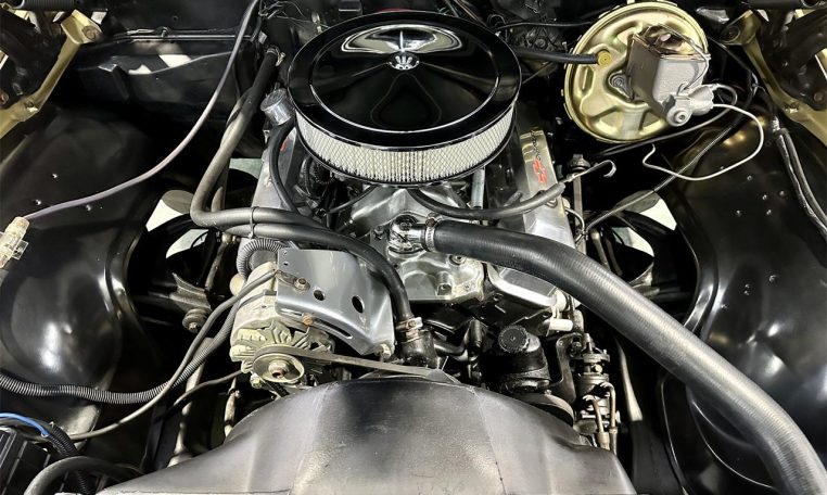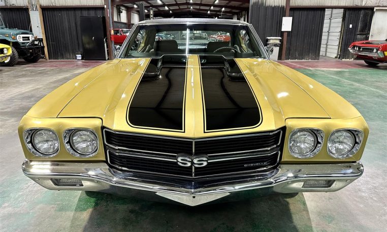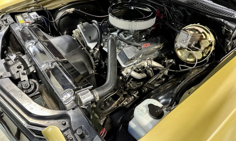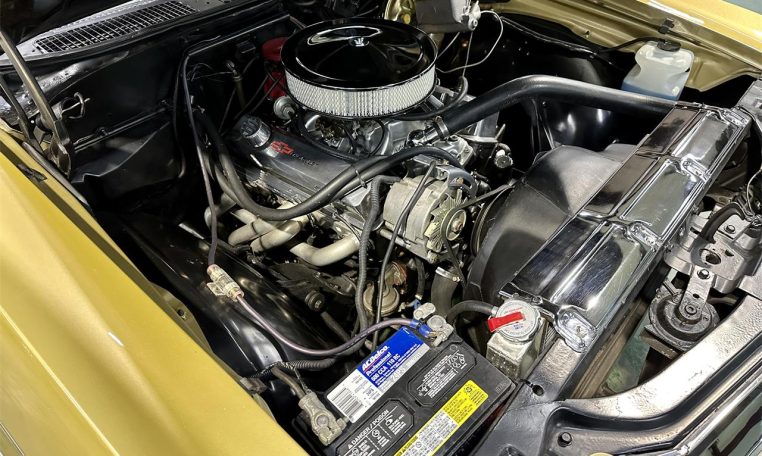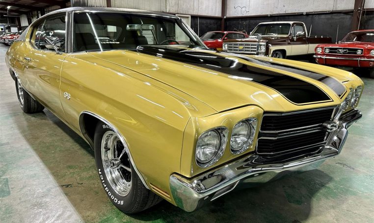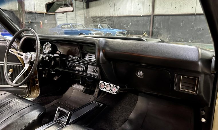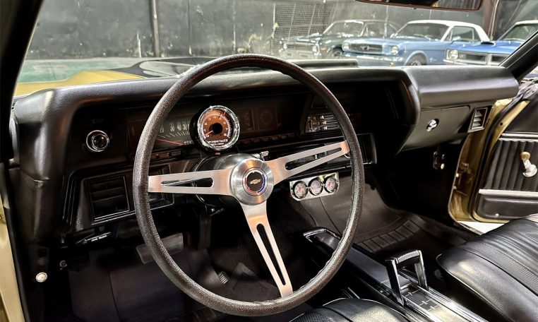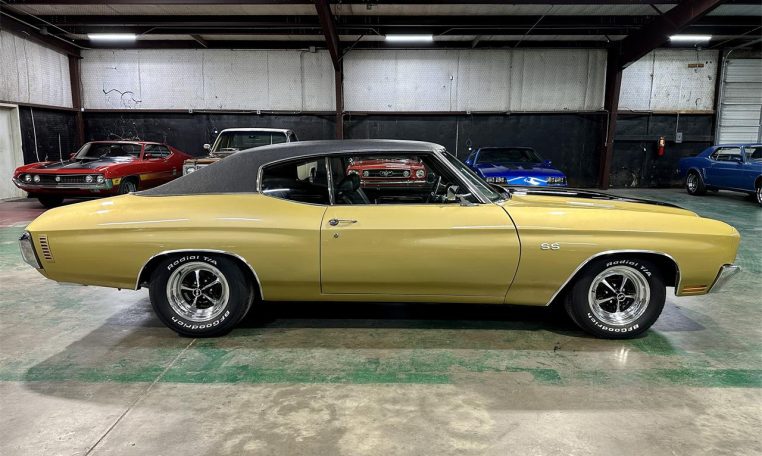 This 1970 Chevrolet Chevelle features a strong GM crate 350 V8 engine paired with a Turbo 350 automatic transmission and a 10 bolt rear end. It has power steering and power front disc brakes with drilled and slotted rotors, along with front drop spindles and rear lowering springs. Finished in solid Champagne Gold with a black vinyl top, the car sports a cowl hood with black SS stripes and trim (not a true SS). It rides on new 15″ SS wheels with fresh 235/60-255/60 tires. Inside, the black bucket seat interior includes a center console, floor shifter, tilt steering column, and Comfort Grip steering wheel. The Chevelle runs and drives great and is very solid underneath. Odometer reads 40,269 miles (unverified).