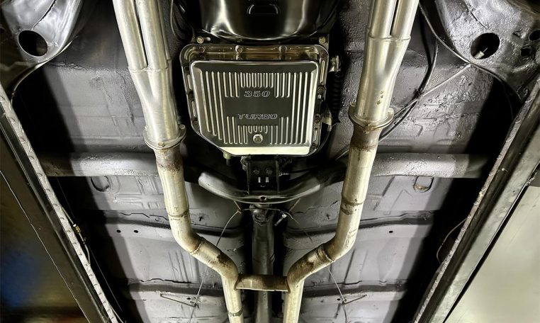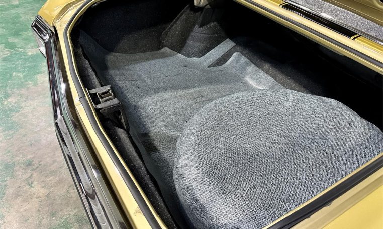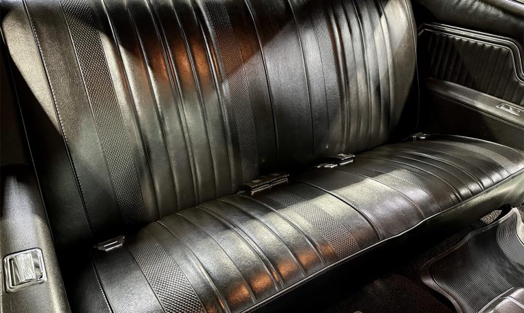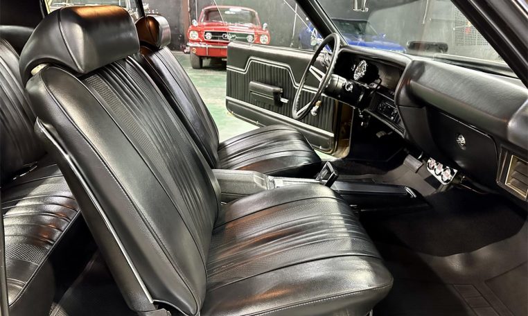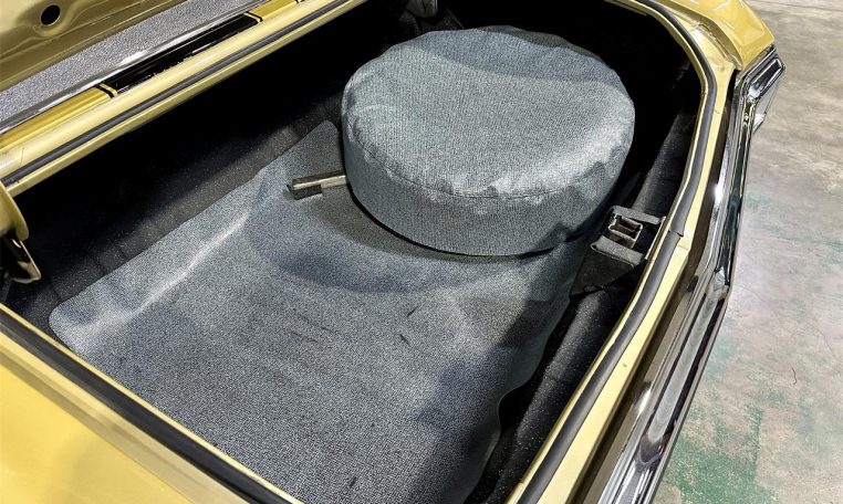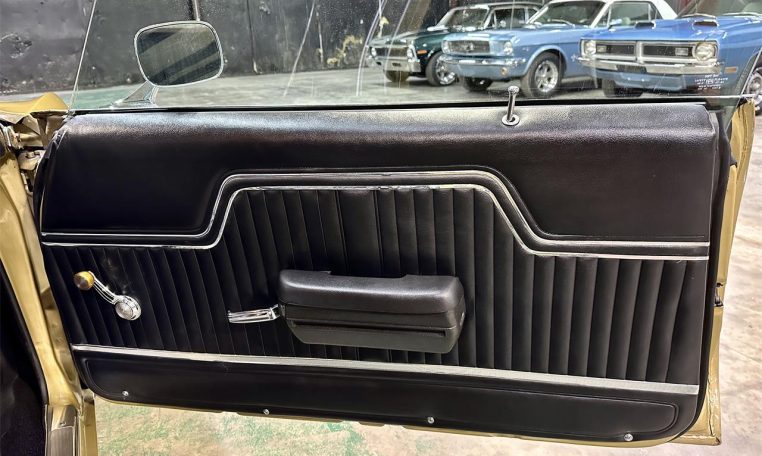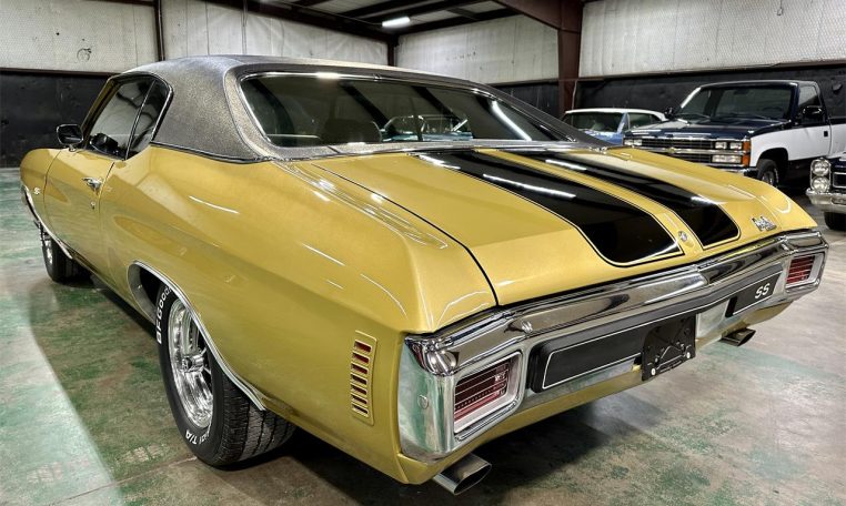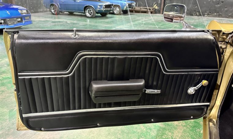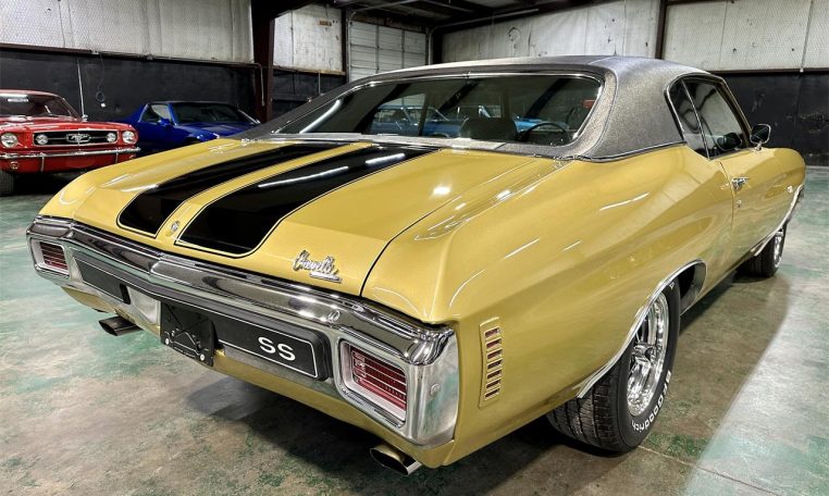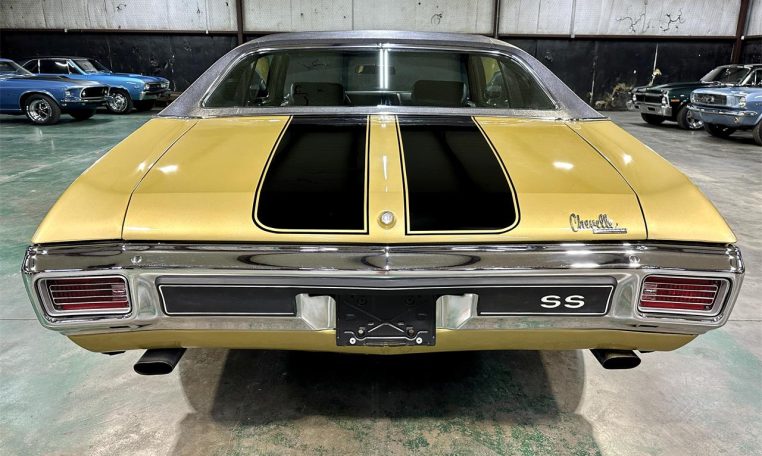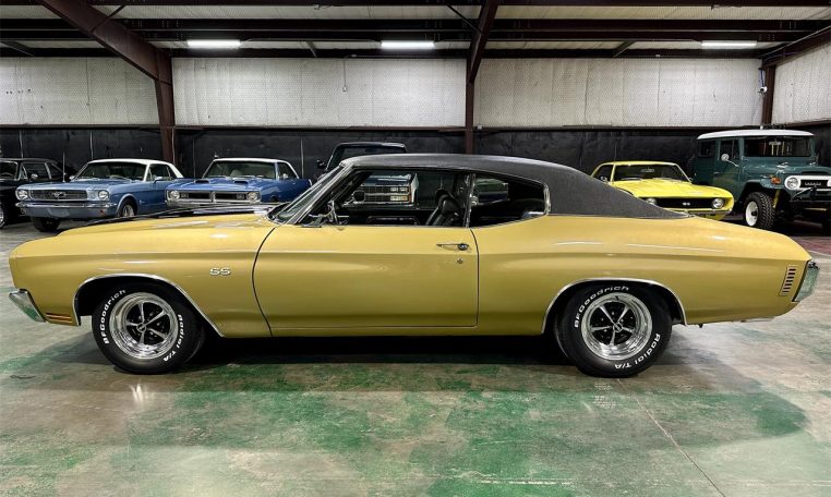 This 1970 Chevrolet Chevelle features a strong GM crate 350 V8 engine paired with a Turbo 350 automatic transmission and a 10 bolt rear end. It has power steering and power front disc brakes with drilled and slotted rotors, along with front drop spindles and rear lowering springs. Finished in solid Champagne Gold with a black vinyl top, the car sports a cowl hood with black SS stripes and trim (not a true SS). It rides on new 15″ SS wheels with fresh 235/60-255/60 tires. Inside, the black bucket seat interior includes a center console, floor shifter, tilt steering column, and Comfort Grip steering wheel. The Chevelle runs and drives great and is very solid underneath. Odometer reads 40,269 miles (unverified).