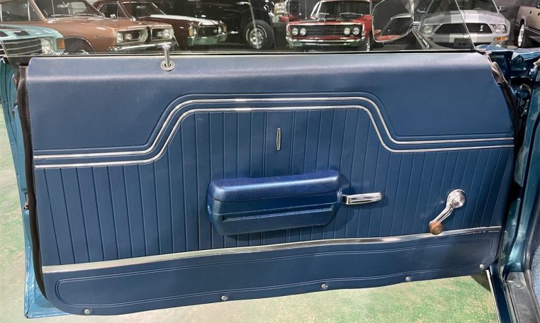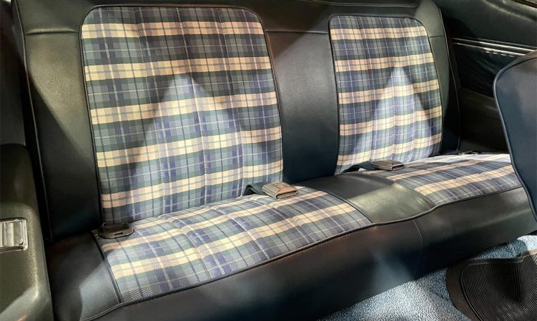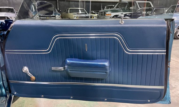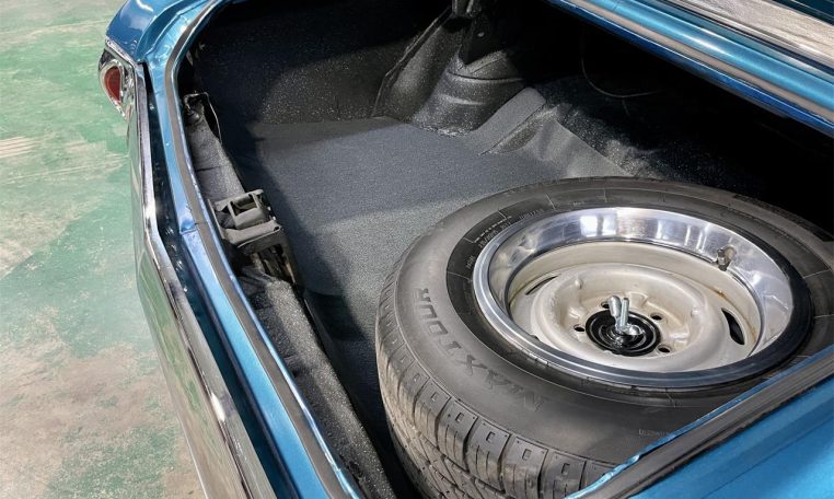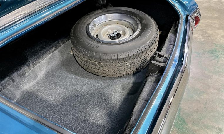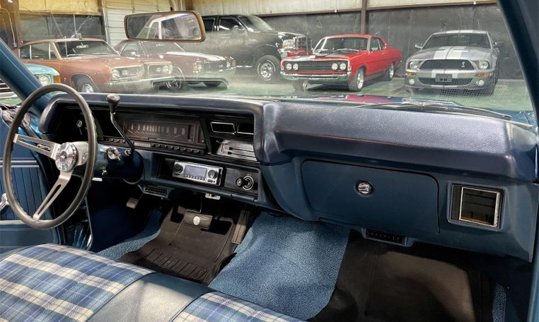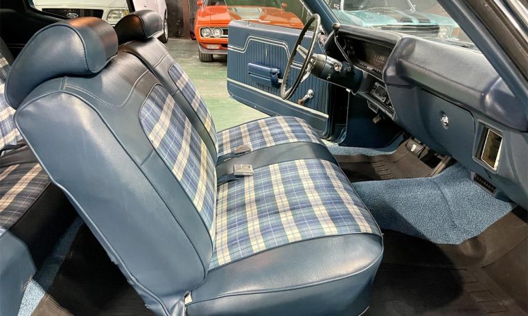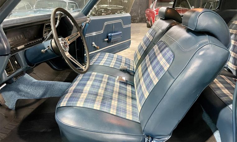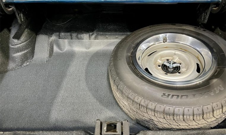 Solid body, Mediterranean Blue paint, 15′ Torq Thrust wheels. Interior with split bench, new plaid inserts, carpet, dash, headliner, AM/FM/USB radio.